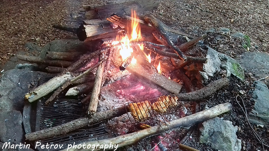 Вечерта с Катя си заформихме кулинарно бедствие, гравирано с приятен летен дъжд през нощта. На няколко места равните поляни предлагат опция за палатки, изградени са огнища, а буковите дървета над всичко това пазят дебела сянка. Птиците наоколо са настроени за концерт, реката е пълноводна и ледено студена! Smile Няколко вида пържоли, още толкова вида пиво и бързо се стъмни. Гората е магична, стига да се абстрахираме от шумната и голяма компания на съседната поляна. Скоро обаче заваля и всички скриха тонколоните със страшната чалга и се прибраха в хижата, където им е мястото...
