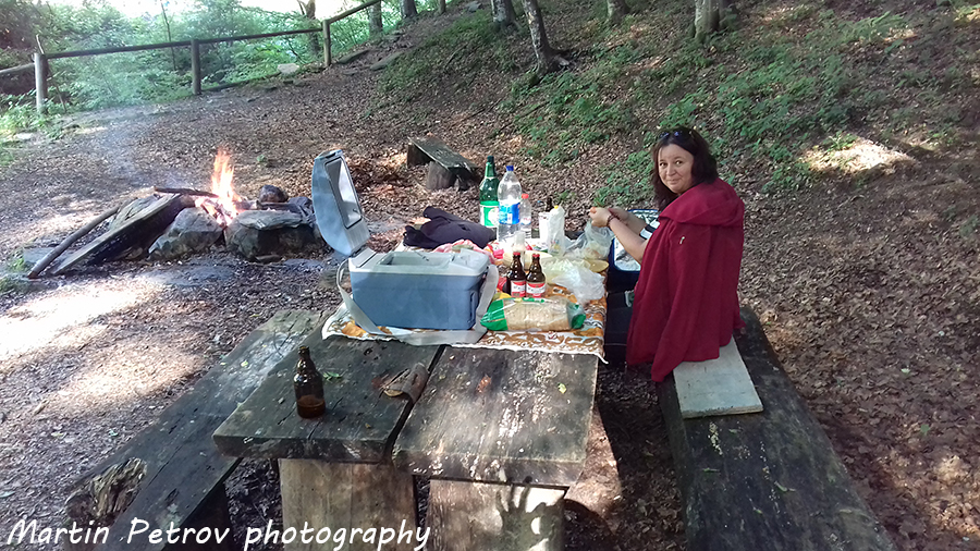 Вечерта с Катя си заформихме кулинарно бедствие, гравирано с приятен летен дъжд през нощта. На няколко места равните поляни предлагат опция за палатки, изградени са огнища, а буковите дървета над всичко това пазят дебела сянка. Птиците наоколо са настроени за концерт, реката е пълноводна и ледено студена! Няколко вида пържоли, още толкова вида пиво и бързо се стъмни. Гората е магична, стига да се абстрахираме от шумната и голяма компания на съседната поляна. Скоро обаче заваля и всички скриха тонколоните със страшната чалга и се прибраха в хижата, където им е мястото...
