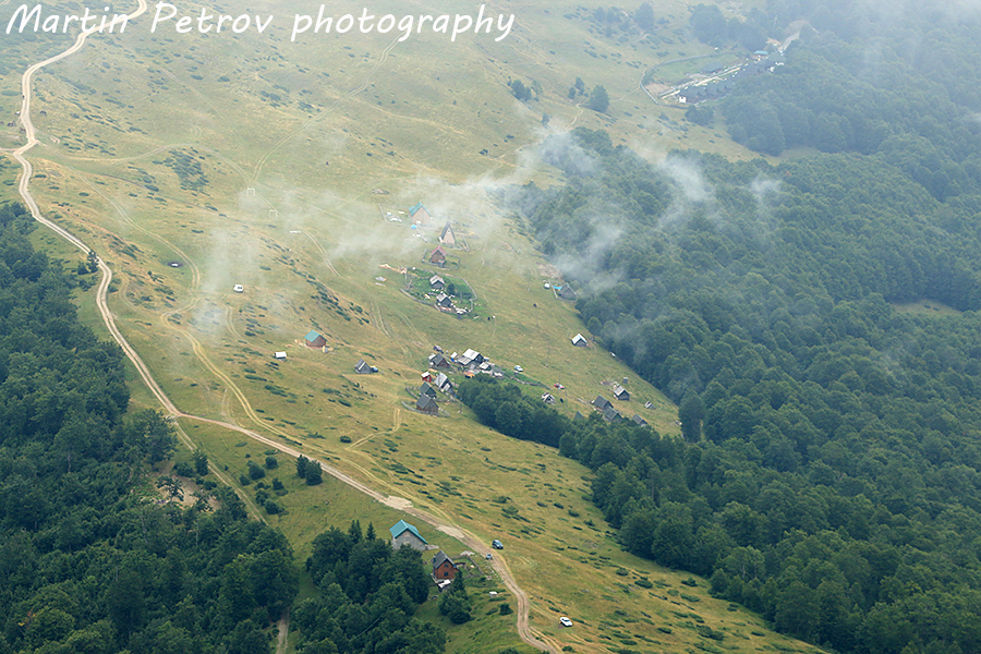 Васоевички Ком вляво и Кучки Ком вдясно. Димо зарежда батериите с боровинки, а Катя ни чака в близост до изходната точка. Наоколо е пълно с нови и по-стари къщи за гости. Всичко е уредено и чисто, прекрасно място за туризъм за всички. По-амбициозните може да се пробват за ден да изкачат двата първенеца на планината, което щеше да ни дойде тежичко, след пътя предния ден с колата, а и имахме нужда да си починем на поляната от първите снимки. Прокрадваха ми се мисли за проба, но слънцето проби сериозно по обяд и мързелът надделя. Заложихме се на една крайпътна и сенчеста чешма, където охладихме цял куп бири... Останалите, които нямат намерения за преходи в планината, се възползват от поляните и приказните панорами. Стада с коне, крави и овце се разхождат наоколо...