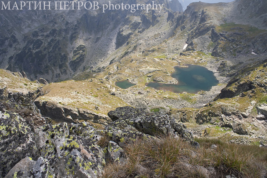 Еленини езера от връх Мальовица. Изкачихме се по пързалящият се североизточен ръб маркиран по камъните с оранжева боя. Маркировката по едно време свърши и се наложиха разни импровизирани експерименти по разни скали...