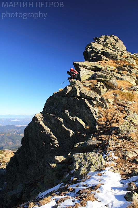 Малко по-късно терена представляваше това. Тесен ръб, по който пътеката пресича отвесните на места скали. Неогрятият от слънце северен склон се зъбеше ледено, докато от юг си беше здраво лято. И Николай по пътеката. Да му се чуди човек на физическите възможности. Тича ли тичаа, а аз снимам ли снимам.
