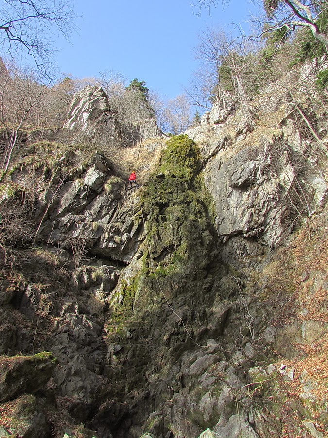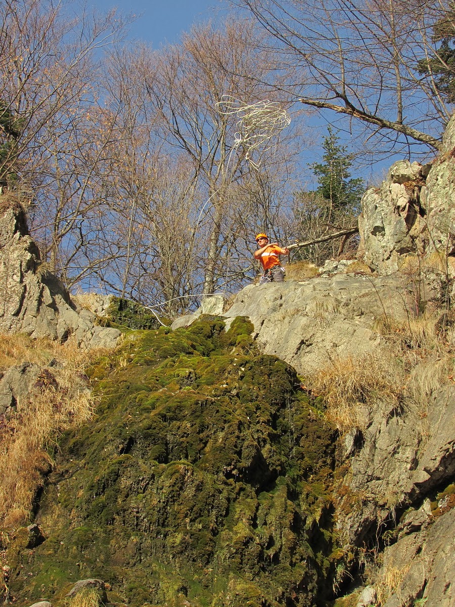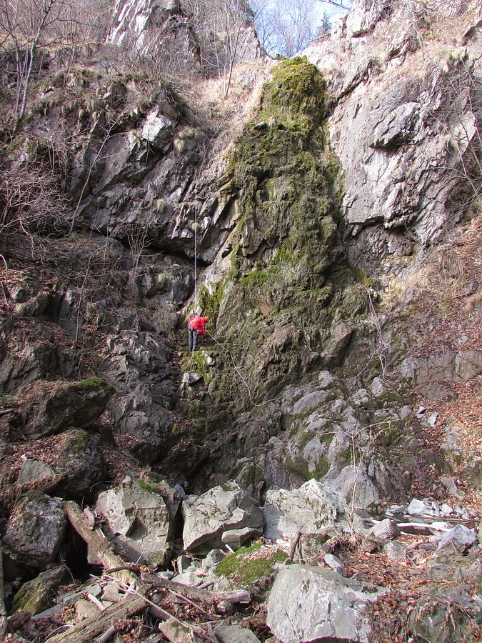 В някакви общи линии това беше и първият ми напълно самостоятелен рапел, който в комбинация с трудният 35м. водопад, липса на дървета в близост до него за огигуровка и т.н. и т.н., "камбана" в средната му част и хлъзгавите скали в самото начало, не внасяха яснота в ситуацията. Разполагах, с около 3 часа за да слезем по светло и се заех с организация на установката, хвърляне на въжето от необезопасените отвеси, въпреки че бях осигурен за площадката. В общ план да спусне рапел човек по водопад си е голяма тръпка, изпълнена с адреналин в критични нива, изключване от проблеми и "важните ангажименти", но и съвесем небезопасно за подготовка и успешно изпълнение занимание.