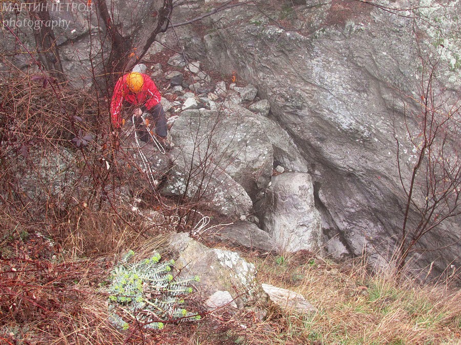 В горната част на водопада, има едно място за слизане, на което човек трябва да е супермен без да се пребие (слиза се на къс рапел с установка от клинове). Дву метров водопад, по който иначе да се слезе е почти немислима задача. "Пътечка" с единственото място за подход, по който изглеждаше минаваемо подсича изключително стръмният склон, от който на метър под "пътеката" се вижда това от долната снимка, само че погледнато отгоре. Натоварен с въжета и инвентар стъпвайки на пръсти, се озовах на площадката, от която изхвърлих въжето, след като разбира се го вързах за предварително направената установка.