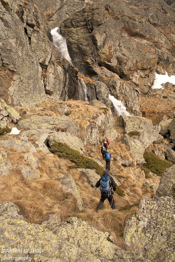 Има излаз нагоре покрай водопада към Каракачански егрек, но трябва да се прегази там. Ако е по-малко водата просто се прескача по камъните. Над водопада има още едно пресичане, но там имаше пряспа и минахме успешно по снега, снежното мостче издържа, като имаш впредвид, че сме фини и елегантни, особено аз.