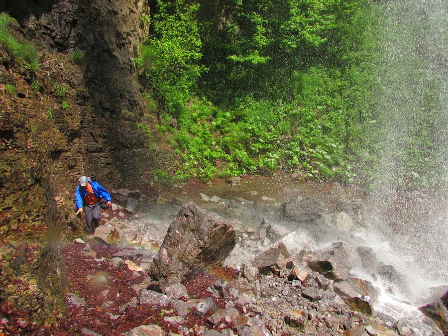 Забавлявайки се по мокрите скали ме полазиха нотки на притеснение! Катя и Жоро се бяха забавили достатъчно време за да си помисли човек, че се е случило нещо лошо. Нямаше обхват на мобилните телефони и тъкмо мислех да се връщам да ги търся, когато над мен се появиха ухилените им и доволни от гледката физиономии. Тъй като снимах от десният склон се опасявах да не съборят нещо на главата ми, те се движеха оттам... Катя се е подхлъзнала на скалите докато са се предвижвали и паднала да се свлича по полегатият склон, но скоро спряла! Освен с уплаха и малко кръв по ръката, и синина на кракът, беше видимо добре и готова да продължим напред. Сега вече времето е топло и хората извадиха летните си дрехи, а тя ходи с дълги ръкави на работа... Както споменах в началото, малко хора стигат дотук и ако имат късмет да видят водопада с вода се връщат надолу. С Жоро се майтапихме как може да срещнем майки с колички по-натам. Дотук беше с трудната част от подхода, следваше да изпълним и страшната.
