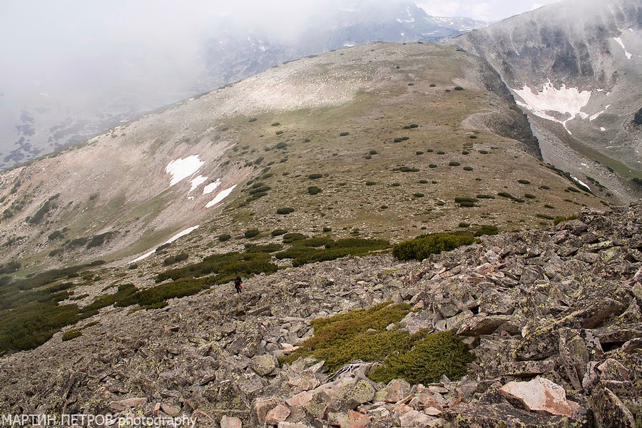 Два часа по-късно под зоркият поглед на жаркото слънце пъплихме по ръба към връх Полежан - 2851м.н.в.
