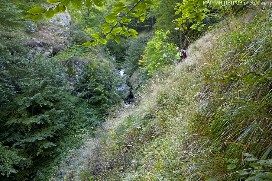 Делчо по склона. Крепящи се за тревните туфи пробивахме бавно и изморително. Приказни вирове се показваха след всяко следващо изпитание, на което ни подложи резерват Джендема в този слънчев октомврийски ден.