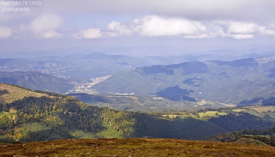 Моториста остана още на връх Мара Гидия, силуета му е като точка, вляво връх Баба и вдясно град Етрополе.