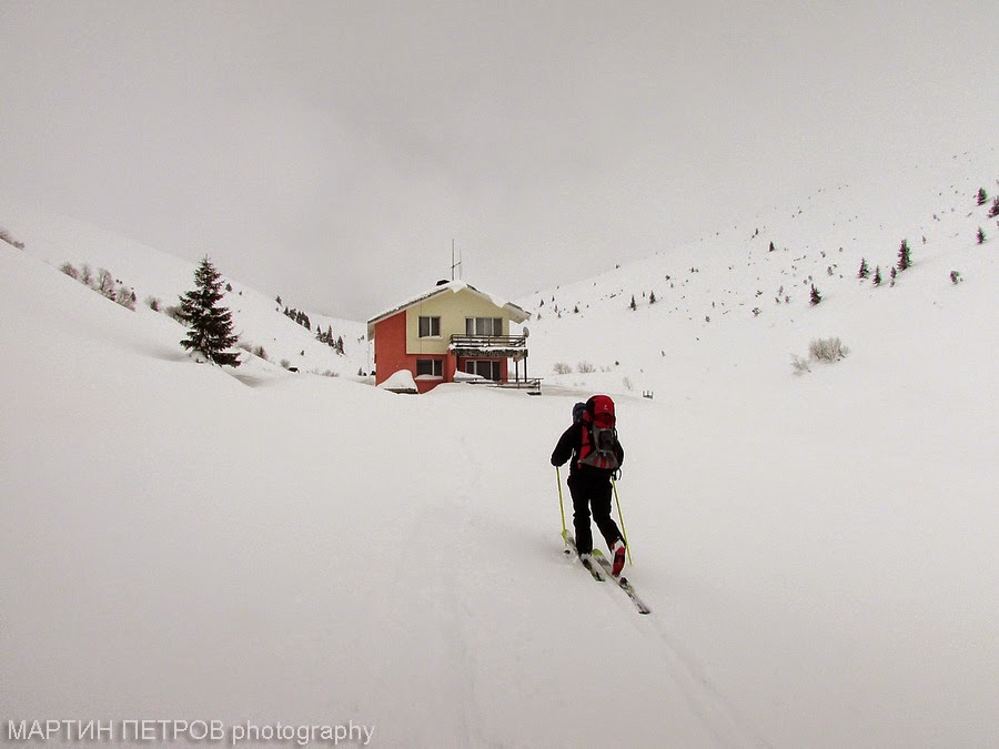 Скоро наближих кантона под хижата, (скиорите ме амбицираха да потичвам, налагайки добро темпо догонвайки ги, но те са джедаи, нямат стигане) дотук се стига и с коли през лятото. Все още е мъгливо, времето като цяло беше динамично - предлагаше гледки, скриваше ги, зимни му капризи. Притеснявах се за останалите от групата, дали щяха да успеят в тези условия без снегоходки, по телефона не звучаха зле, но усещах как само като натиснех червената слушалка, по билото отекваше ехо от викове по мой адрес... Не очаквах да се дръпна толкова бързо, замислях да се кача и до обзорния голям Мечи връх, но нямах почти никакъв шанс да успея да сляза по светло, чакаха ме два часа копане на сняг и установяване на палатка!