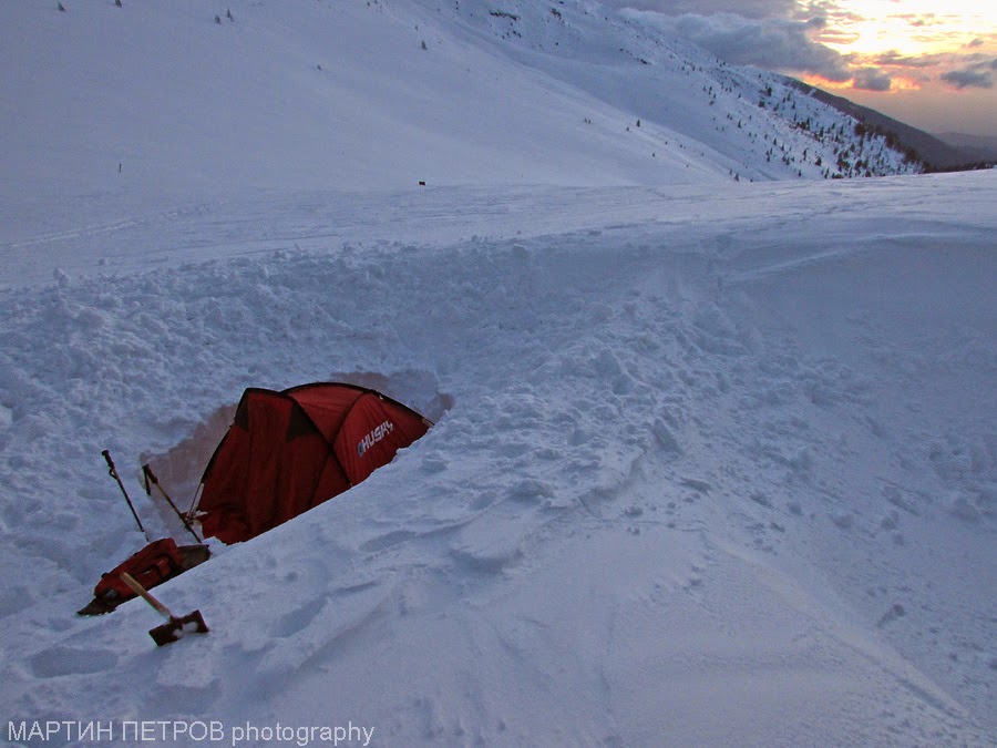 Всичко беше прекалено хубаво за да е истина, но ето тази дупка там, под палатката от следващите снимки, чакаше мен. Да не е окопана палатка в зимни условия си е забавен сценарий, ама за този отгоре, който движи облаците... Не беше забавно обаче това с копането. Близо два часа хамалогия! Е, успокояваше ме факта че Иван, Катя и Таня пуфтяха все още затъвайки в дълбокия сняг!!! Ако не бях видял какво количество храна бяха изнесли тези на вид кротки хора, нямаше и да повярвам. В това време се събра публика от скиори и туристи, обстрелваха ме като картечари с фотоапарати и въпроси, подпитваха за лудостта ми, щото палатката беше в раницата все още, а аз копаех някаква дупка като обезумял с лавинна лопата, разбирайте хижарски фараш...
