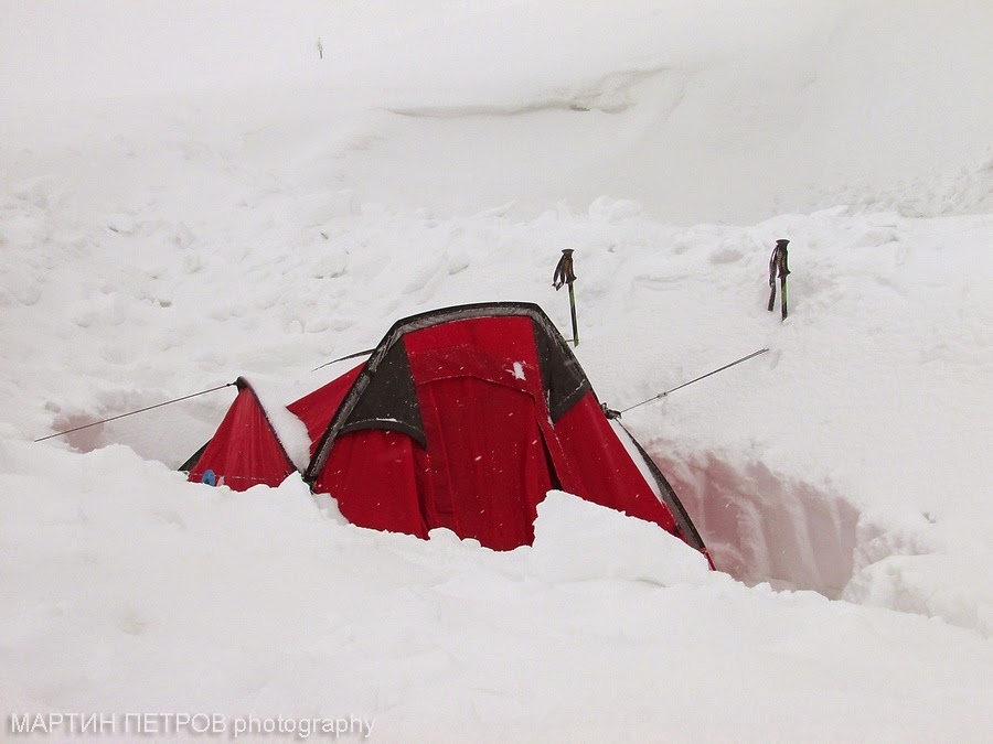Стигнах хижата бързо. Викнах силно и отвътре Катя ми отговори. Доспиваше си в затоплената и заледена палатка. Видимо е, имало е среднощен купон - вятър и сняг са се стоварили в лагера ни!