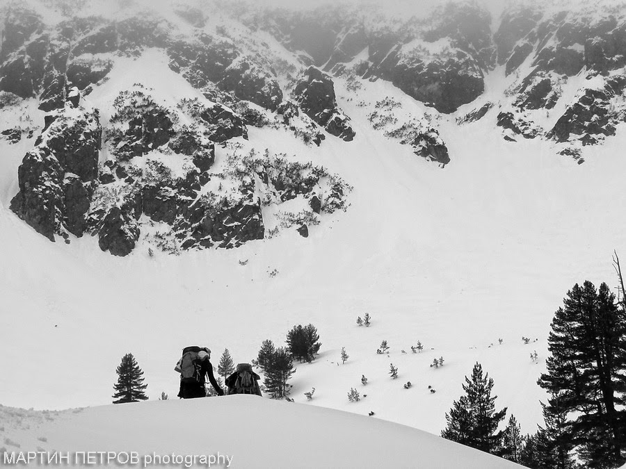 Редувайки се в прокарване на пътека с много почивки излязохме от резерват Баюви дупки в подножието на Ушиците. Мъглата във високото е прегърнала билото на върховете. Катя нямаше снегоходки, но знаейки колко е упорита - предположих, че ще стигне по пъртината ни дотук! По телефона час по-късно стана ясно, че е пробила. Алпийската стена на Даутов връх. По улеите ясно личаха нападали лавини.