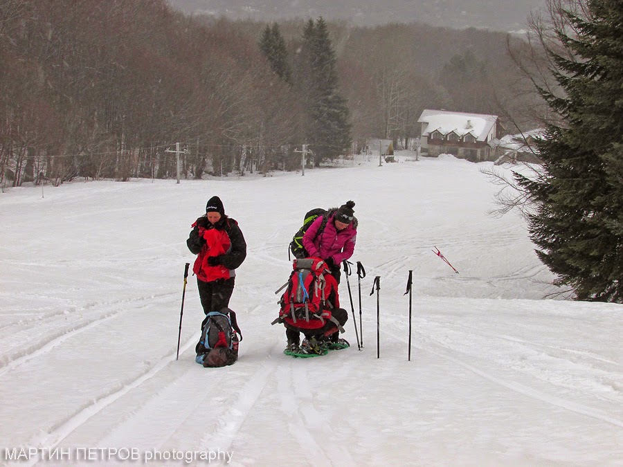 Слагаме снегоходките, докато ветровитата писта се опитва да ни грабне ръкавици и шапки. Очакваха ни 1400м. въходяща денивелация до връх Даутов. Дали щяхме да успеем не знаехме, но поне щяхме да раздвижим и разскърцаме колене и стави.